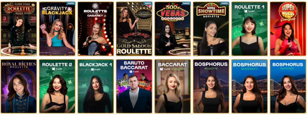 - 🎥 Casino en Vivo: mesas de ruleta, blackjack y game shows dirigidos por crupieres reales.