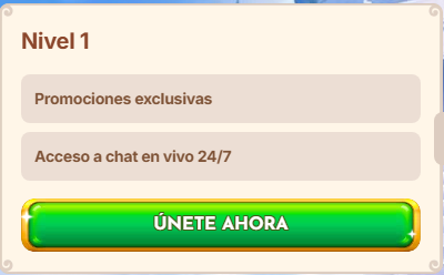 | Nivel 1 | Promociones exclusivas, acceso a chat en vivo 24/7. |