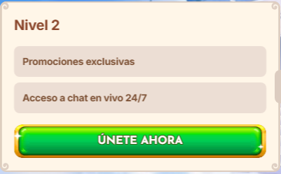| Nivel 2 | Promociones exclusivas, acceso a chat en vivo 24/7. |
