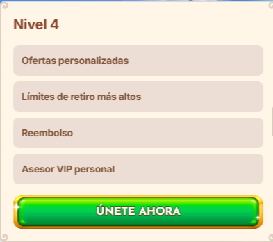 | Nivel 4 | Ofertas personalizadas, límites de retiro más altos, reembolso, asesor VIP personal. |