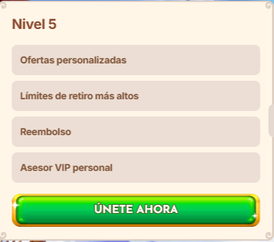 | Nivel 5 | Ofertas personalizadas, límites de retiro más altos, reembolso, asesor VIP personal. |