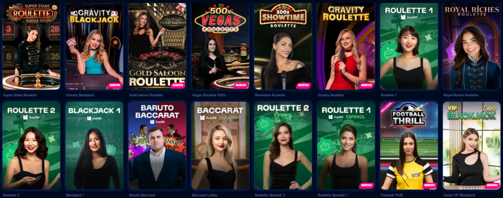 - Juegos de Mesa: Ruleta, blackjack, baccarat, póker y variantes modernas con diferentes límites de apuesta.