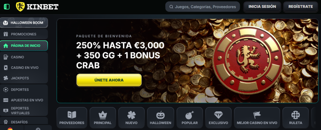 Kinbet Casino se presenta como una plataforma moderna y completa que combina casino online y apuestas deportivas bajo licencia de Curazao. Su catálogo de juegos es extenso, con tragaperras, ruleta, blackjack, juegos en vivo y títulos populares de tipo crash como JetX o Plinko. Los bonos son atractivos, especialmente el paquete de bienvenida del 250% hasta 3.000 € + 350 giros gratis, y el sistema VIP añade valor con beneficios progresivos.
