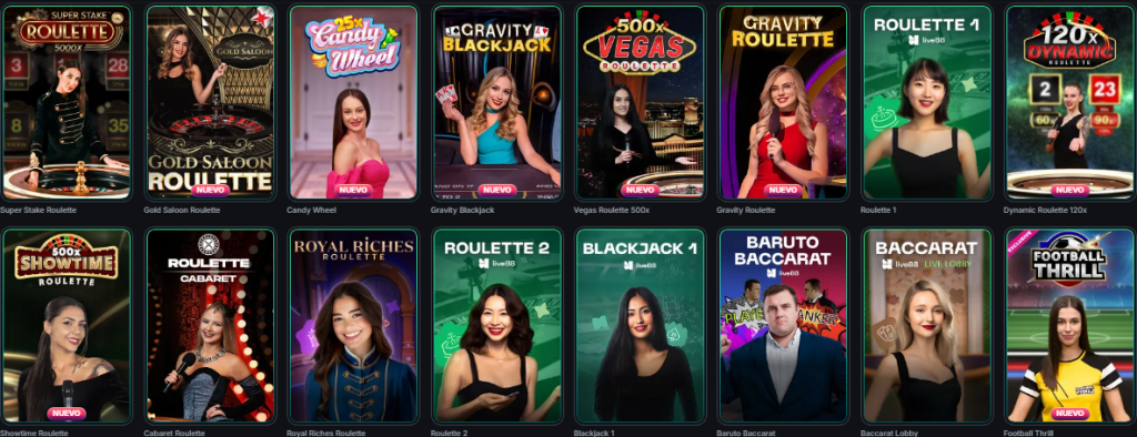 - 🎥 Casino en vivo: Mesas con crupieres reales en tiempo real, disponibles las 24 horas, con opciones de chat y múltiples idiomas.