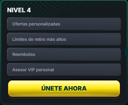 | Nivel 4 | Ofertas personalizadas, límites de retiro más altos, reembolso y asesor VIP personal. |