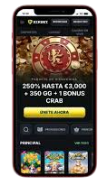 El casino ofrece un paquete de bienvenida del 250% hasta 3.000 € + 350 giros gratis + 1 Bonus Crab en la sección de casino y un 100% hasta 100 € en apuestas deportivas.