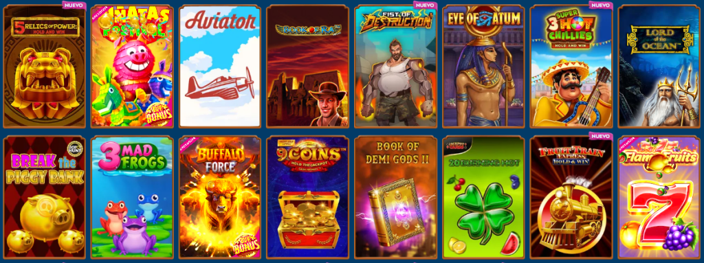 - Tragamonedas (Slots): incluye títulos populares, jackpots progresivos, temáticas de aventura, fantasía y mitología.